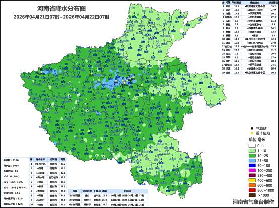 省气象台监测显示,4月21日7时至22日7时,我省大部出现小到中雨,其中郑州、三门峡、许昌、平顶山、南阳等地局部大雨,全省平均降水量12.5毫米,地市平均降水量位列前三的分别为:郑州18.8毫米、三门峡18.3毫米、平顶山17.5毫米;降水量位列前三的分别为:郑州市文苑小区39.2毫米、洛阳市西马39.1毫米、新郑市赵家寨37.1毫米。此外,4月21日20时至22日7时,我省北部、西部出现能见度低于500米的浓雾,其中安阳、鹤壁、濮阳、新乡、南阳、信阳等地部分县(市、区)出现最低能见度小于等于200米的强浓雾。最低能见度前三站分别为:嵩山42米、鸡公山93米、卫辉102米。