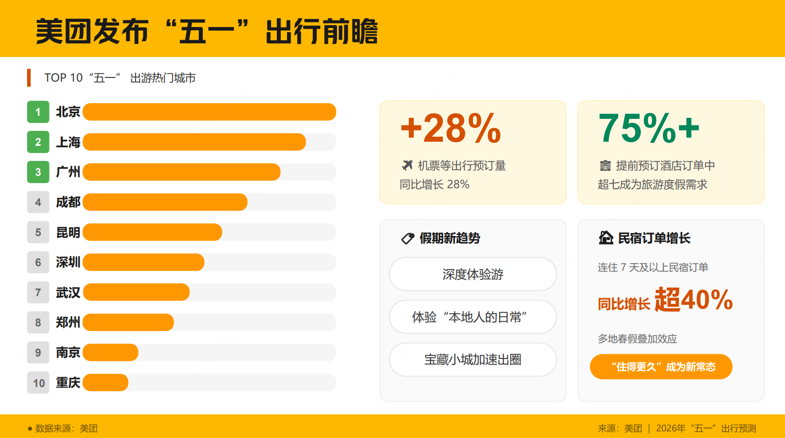 “五一”假期临近,国内出行热度持续攀升。4月21日,美团发布的数据显示,“五一”期间,机票等出行预订量同比增长28%。叠加多地春假等因素,“住得更久、玩得更深”的深度体验游成为假期新趋势。据美团数据,在所有提前预订的酒店订单中,超过七成来自旅游度假需求,连住7天及以上的民宿订单量同比增长超过40%。