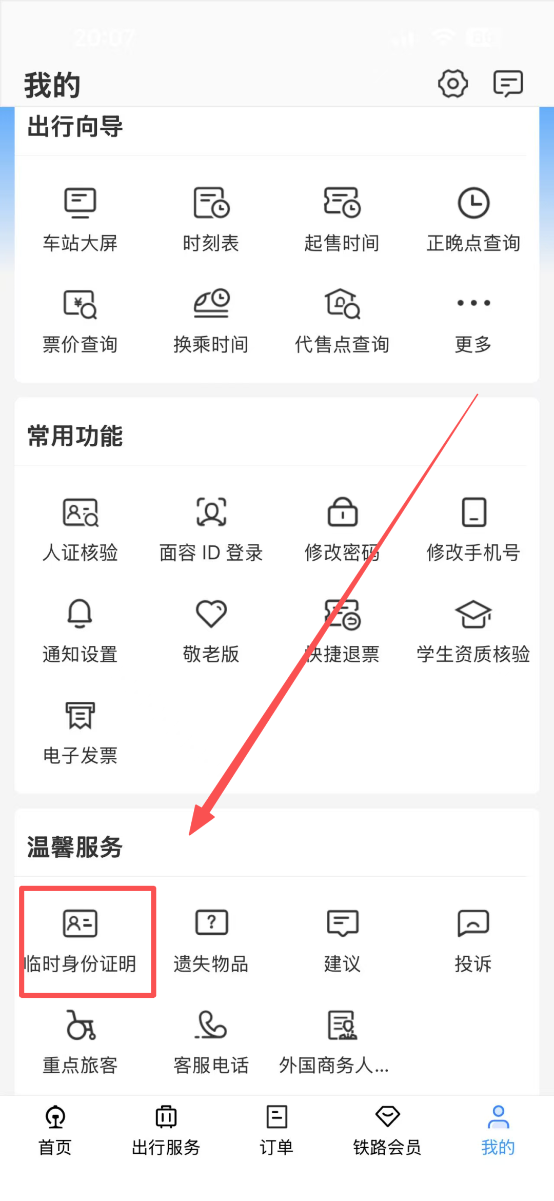 1️⃣点击“铁路12306”App中【我的】,选择【临时身份证明】。