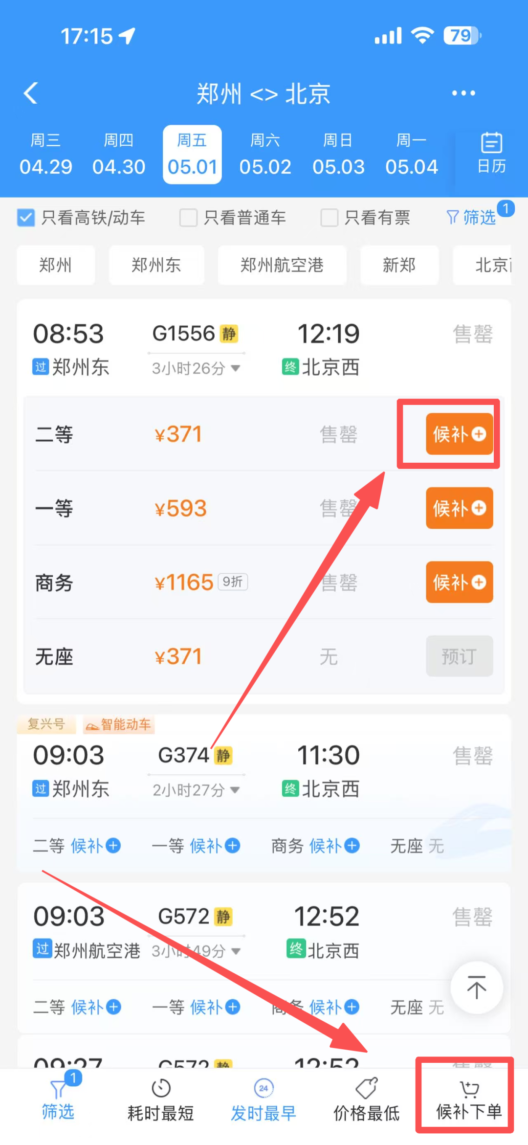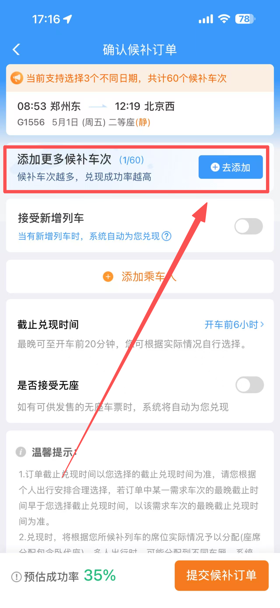 1️⃣提交候补时,尽量增加一些候补车次与日期,每个订单可选择3个乘车日期、最多60个候补车次,选择的候补车次越多,成功率越高;