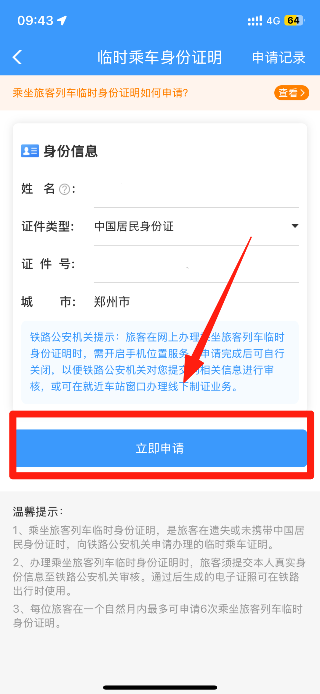 2️⃣按提示填写个人真实信息,点击【立即申请】进行人脸识别;审核通过后,即可使用临时乘车身份证明。
