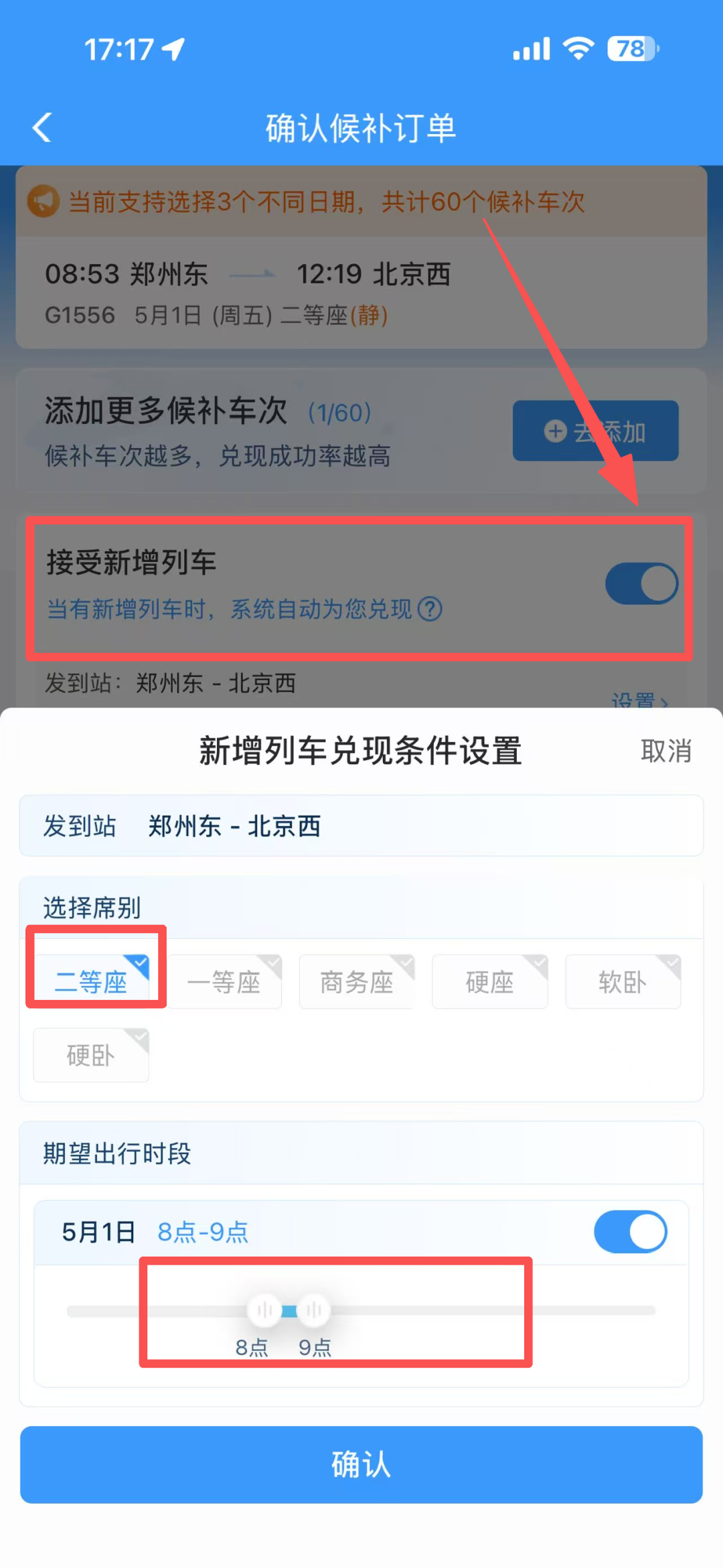 3️⃣在“接受新增列车”选项下,可以选择希望出行的时段和座位类型,更容易候补到满意车票