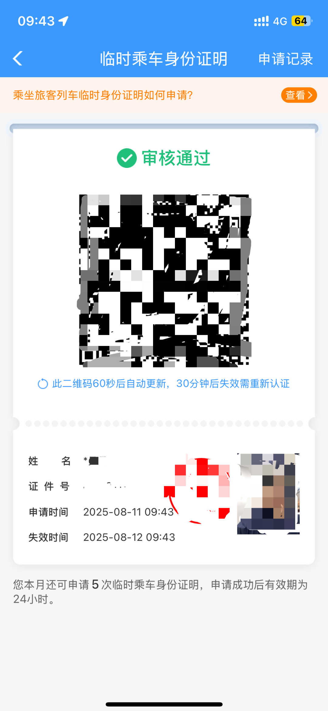 2、电子临时乘车身份证明的动态二维码60秒自动更新一次,为了避免他人冒用,二维码生成后每30分钟需要用户重新通过人脸核验。