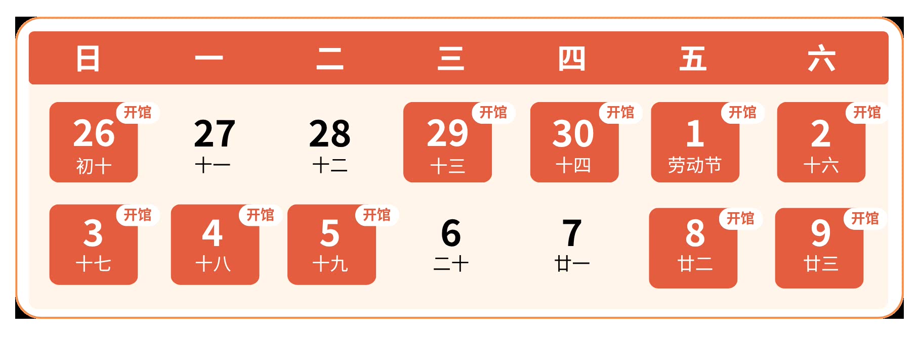 4月29日(周三)至5月5日(周二)正常开馆。