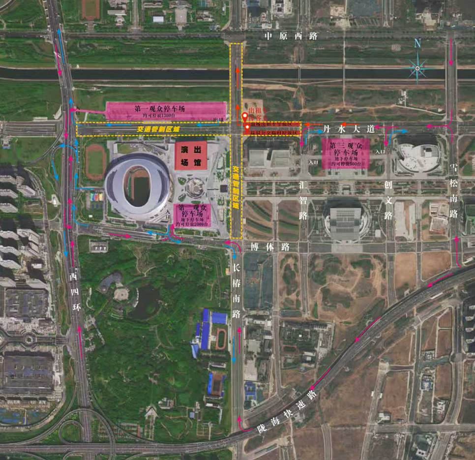 设在郑州CCD PARK地下停车场。观众车辆沿雪松南路——丹水大道(向西)——分别在创文路和汇智路驶入停车场——进入地下停车场停放(丹水大道与汇智路交叉口以西禁止观众车辆通行);退场时,车辆驶出停车场出口后——经丹水大道向东驶离活动现场。请扫描下方二维码导航前往停车场。该停车场饱和后,请根据交警及工作人员指挥或导航提示,前往其他停车场停放。