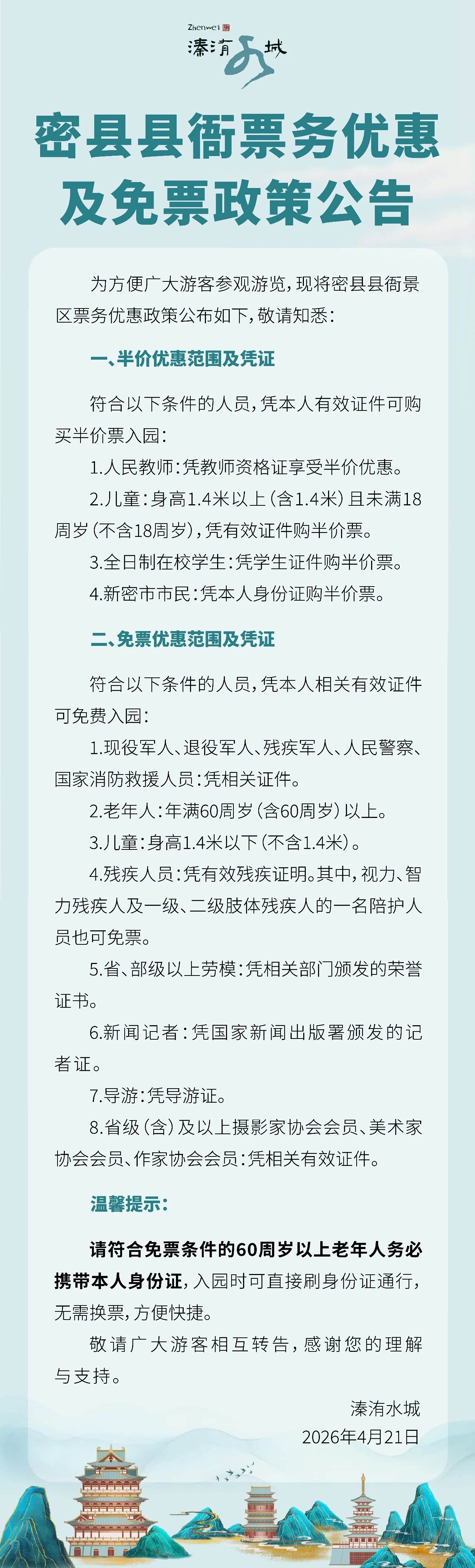 4月23日,记者从溱洧水城获悉,符合条件的游客可享受密县县衙票务优惠及免票政策。