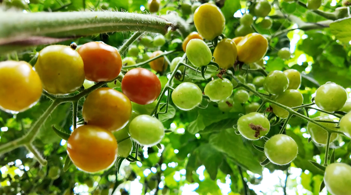 这边的小番茄已经进入最佳采摘期,那边的小吊瓜也是长势喜人,饱满圆润、或黄或绿的小吊瓜垂挂在枝蔓间,为大棚增添了不少生机。