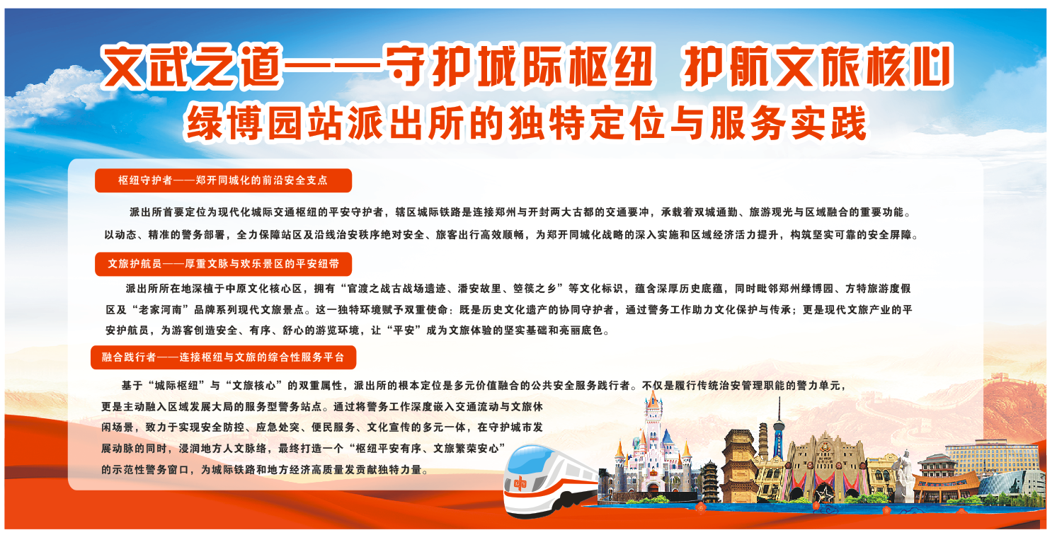 绿博园站派出所地处中牟——一座千年古县,既有官渡古战场的智谋底蕴,又有潘安故里的文雅气息,箜篌之乡的悠远韵律也源自这里。与此同时,辖区还紧邻郑州绿博园、方特旅游度假区以及“老家河南”系列文旅地标,是郑开同城化交通大动脉上的重要节点。
