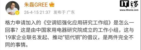 4月15日,格力澄清:加入该工作组是由中国家用电器研究院牵头的前沿技术研究,与19家企业联名推动的“铝代铜”自律公约为两件完全不同的事。