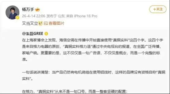 4月14日晚,海信迅速反击,海信空气事业部品牌总监杨祥玺(微博名“杨万手”)评价格力“又当又立”,并甩出2016年媒体报道截图,证明“真铜实料”并非格力独创。