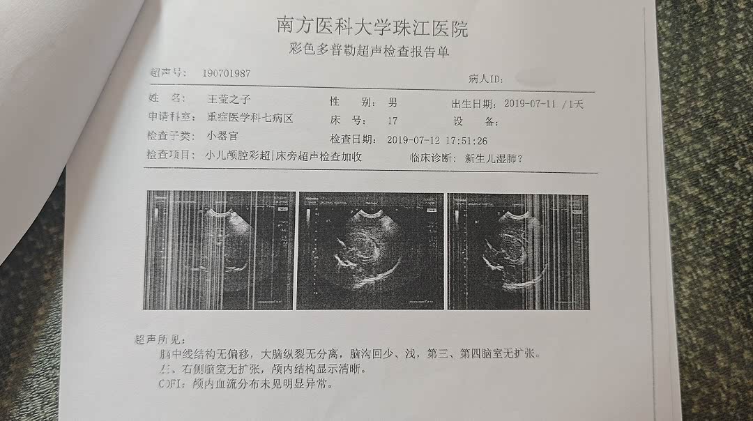 (2019年7月11日出生当天 孩子的颅腔彩超报告)