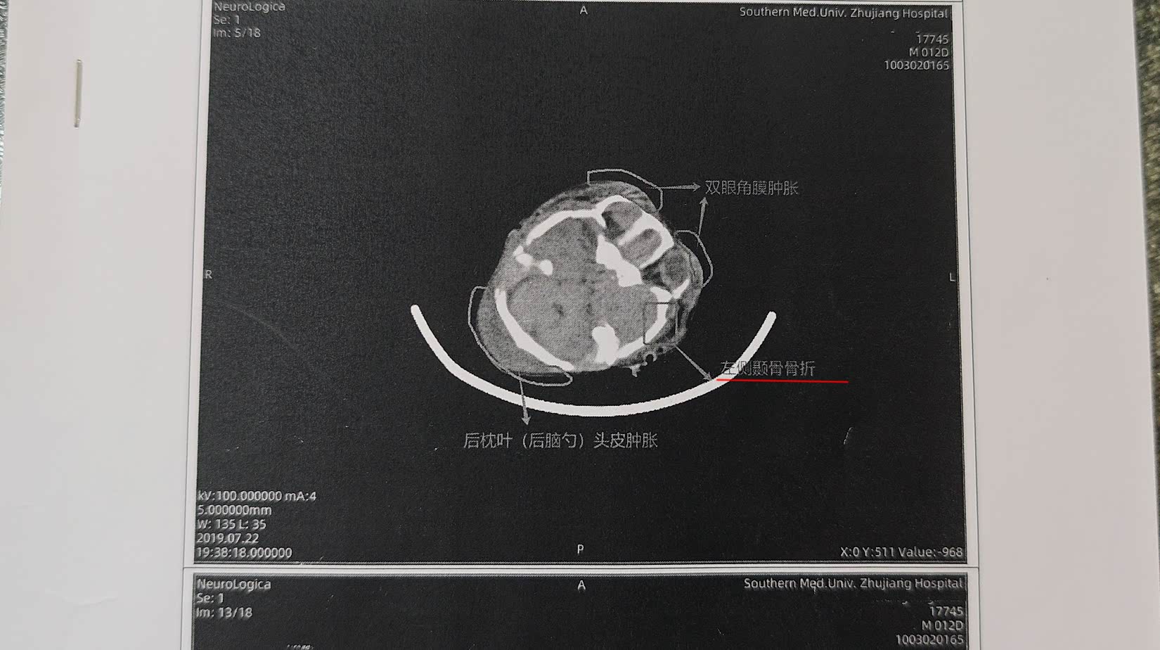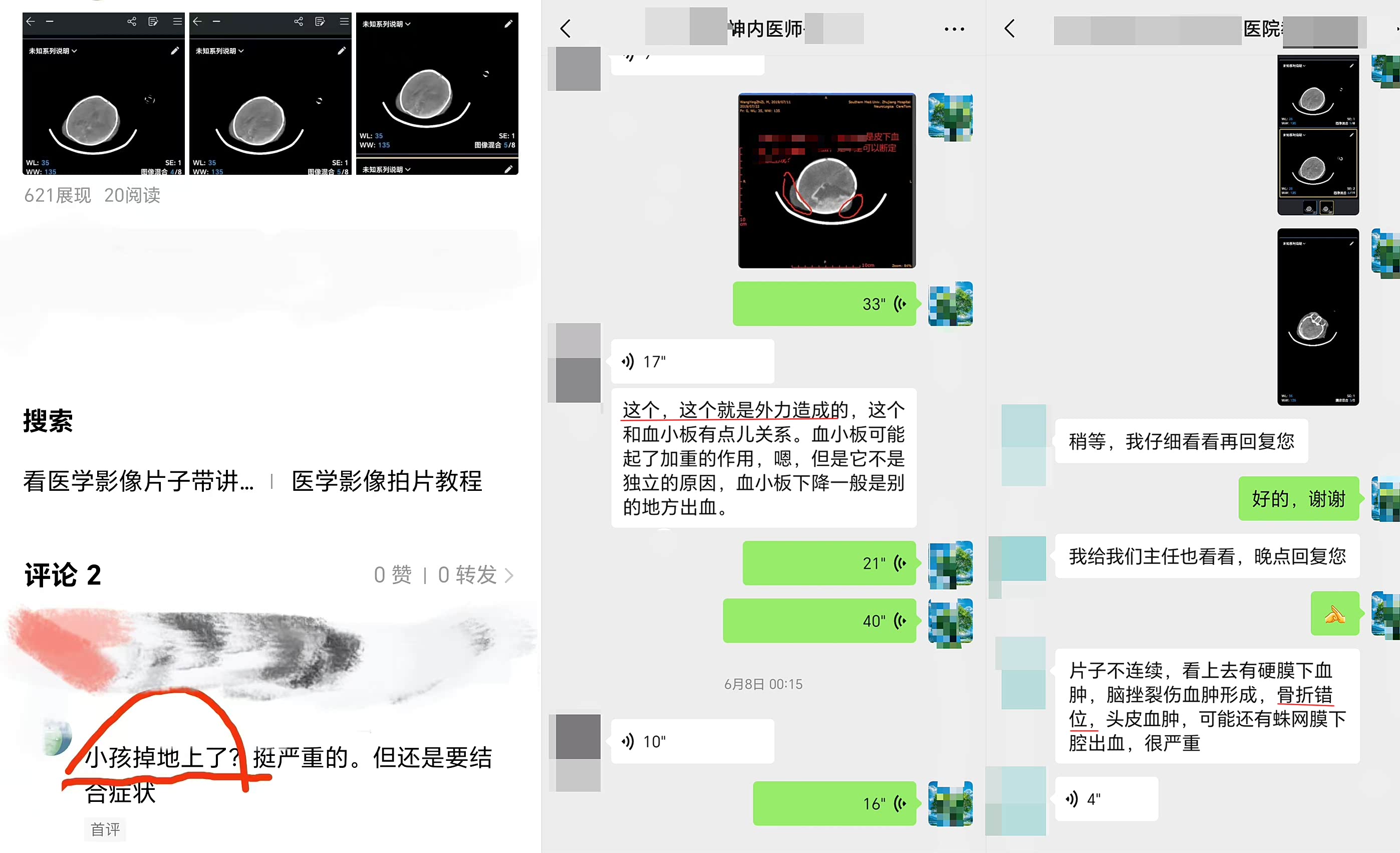 这之后,他们又找到了孩子出生第12天(7月22日)、第19天(7月29日)和第47天(8月26日)拍摄的头颅CT影像片。他们将片子发到了社交平台专业的医学影像交流群里,希望得到医学专家的解答。