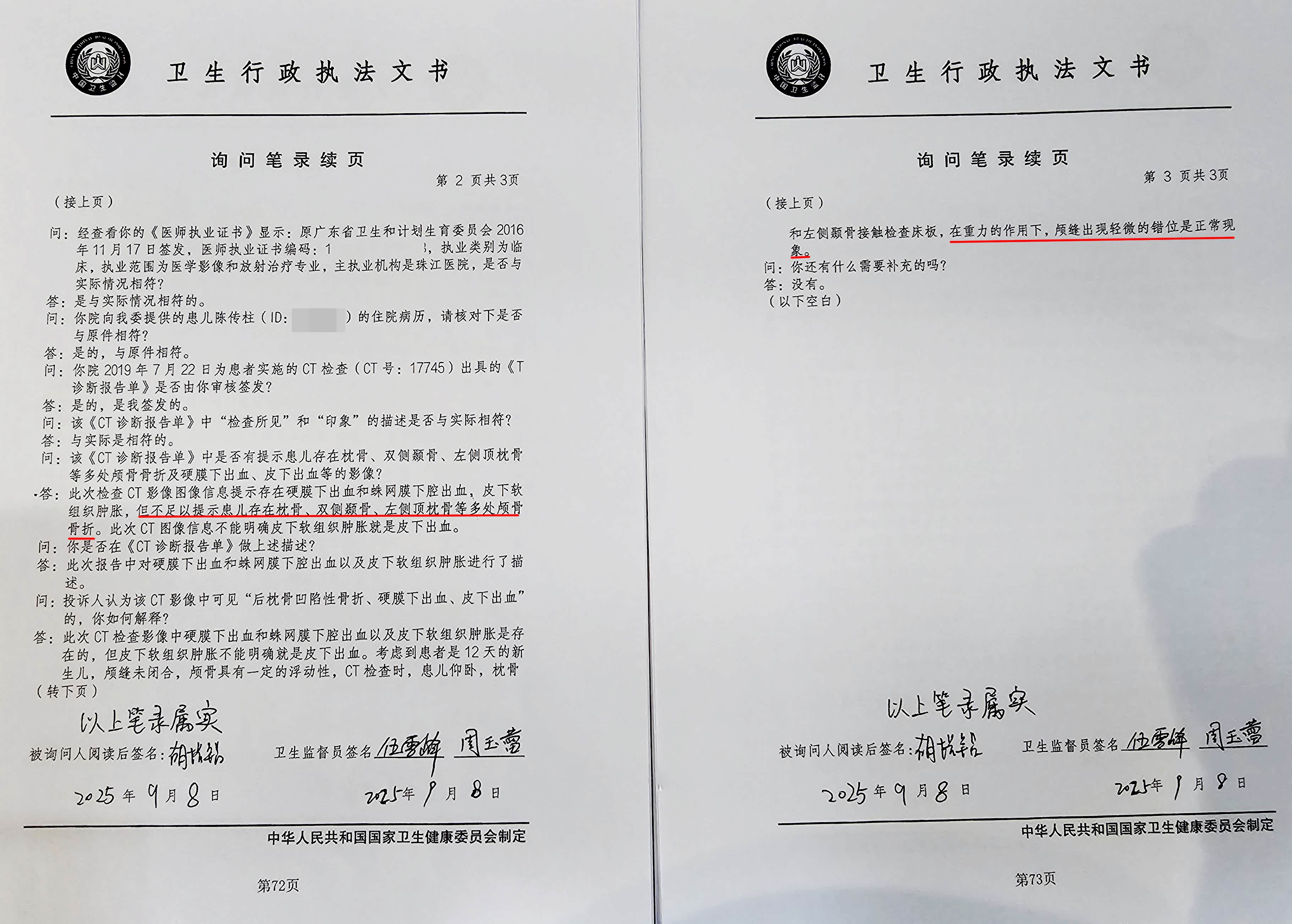 在询问笔录中,珠江医院影像科医师梁波(2006年开始从业)说:“CT检查没有提示患儿存在枕骨、双侧颞骨、左侧顶枕骨等多处颅骨骨折。”