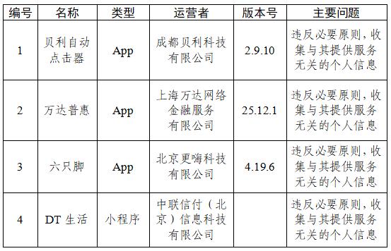 三、贝利自动点击器、万达普惠等4款App违反必要原则,收集与其提供的服务无关的个人信息(详见下表)。