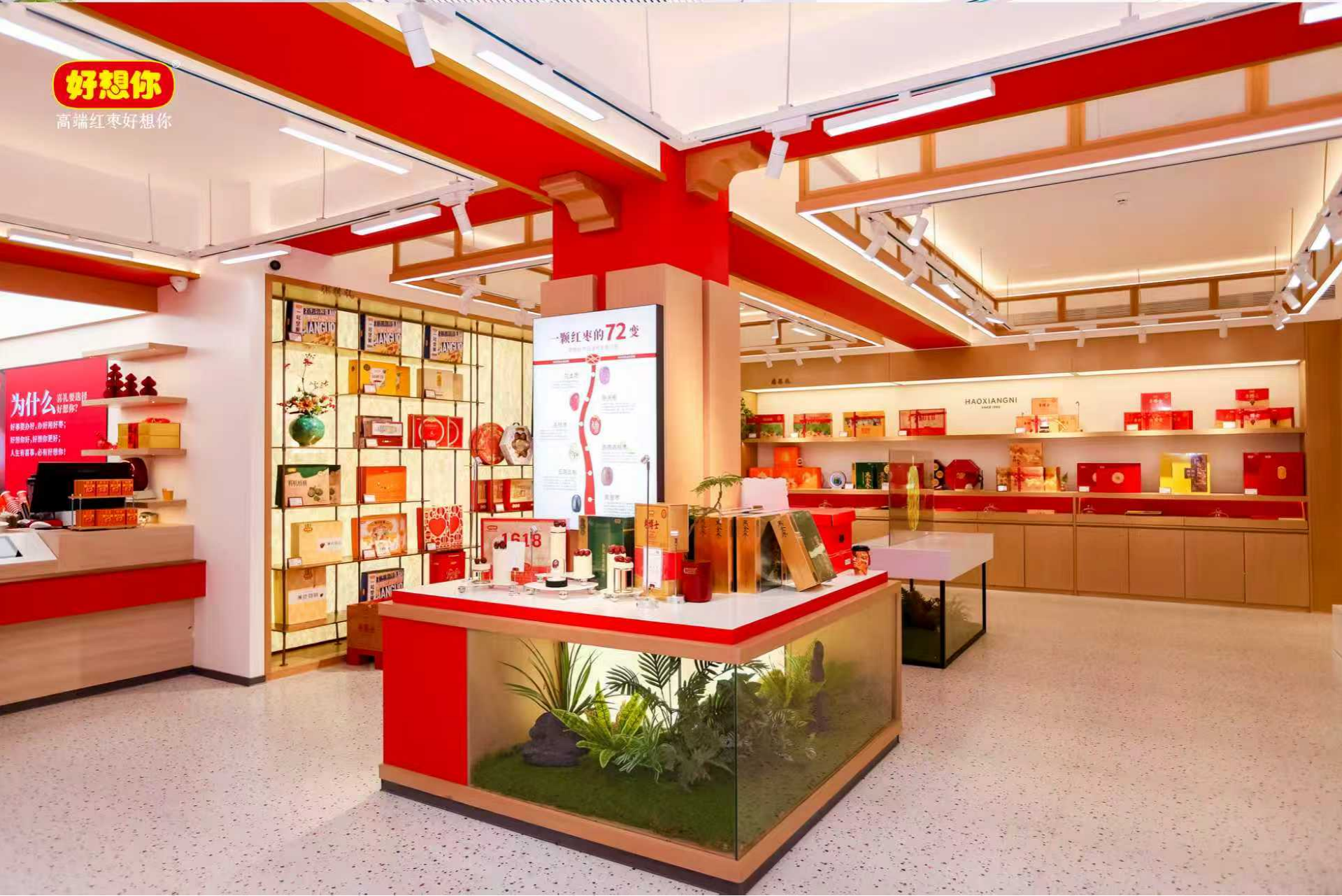 从匠心坚守到品牌焕新,好想你的每一步都扎根中原、放眼全国。这份对品质的执着、对文化的传承,正是城市金名片最坚实的底色! 纵观全新升级,门店外,巨型蝴蝶结门头宛如一枚“思念的封条”,将牵挂与祝福打包其中;橱窗边的“我在这里好想你”主题座椅,成为安放思念的温暖角落。跨进象征尊贵与福气的 “朱门引贵”墙,一楼的伴手礼区、文创区、滋补区、喜礼区、鲜制区错落分布,百元内高性价比伴手礼、“丝牵好运”文创产品、零添加鲜制枣糕与养生浓浆、红火喜庆的喜礼礼盒,满足不同消费场景需求。特别是“红枣 72变”产品陈列,从原枣到黑金枣的全品类展示,直观呈现了好想你在红枣深加工领域的匠心坚守与创新突破。
