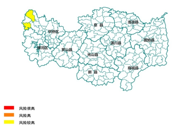 2025年9月17日9时至17日12时,信阳市地质灾害气象风险预警达到黄色预警的区域为:平桥区,发生地质灾害的风险较高。