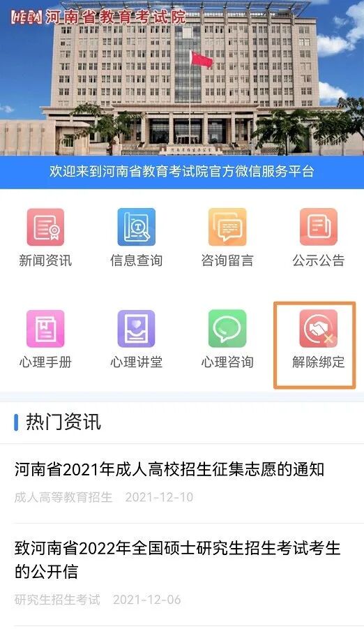 如已绑定考生号,进入“河南省教育考试院”微信公众号,点击下方菜单栏,选择【微服务】->【考生服务】->点击“解除绑定”图标,自行解绑考生信息。