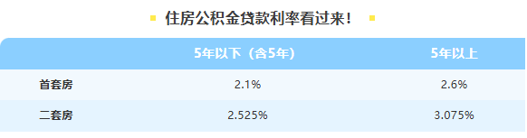 首套房个人住房公积金贷款利率:五年期以下(含五年)由现行的2.35%下调至2.1%,五年期以上由现行的2.85%下调至2.6%。二套房个人住房公积金贷款利率:五年期以下(含五年)由现行的2.775%下调至2.525%,五年期以上由现行的3.325%下调至3.075%。